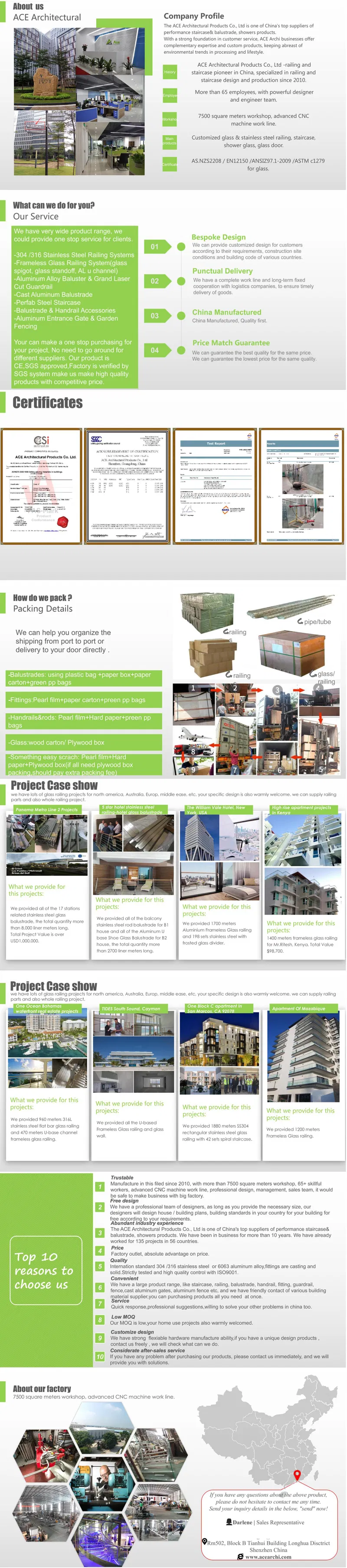 | Balaustrada | Baranda de vidrio de 12mm/acero inoxidable | Vidrio templado o laminado;A3 de Acero;SS304/316 | Claro, satinado o espejo |